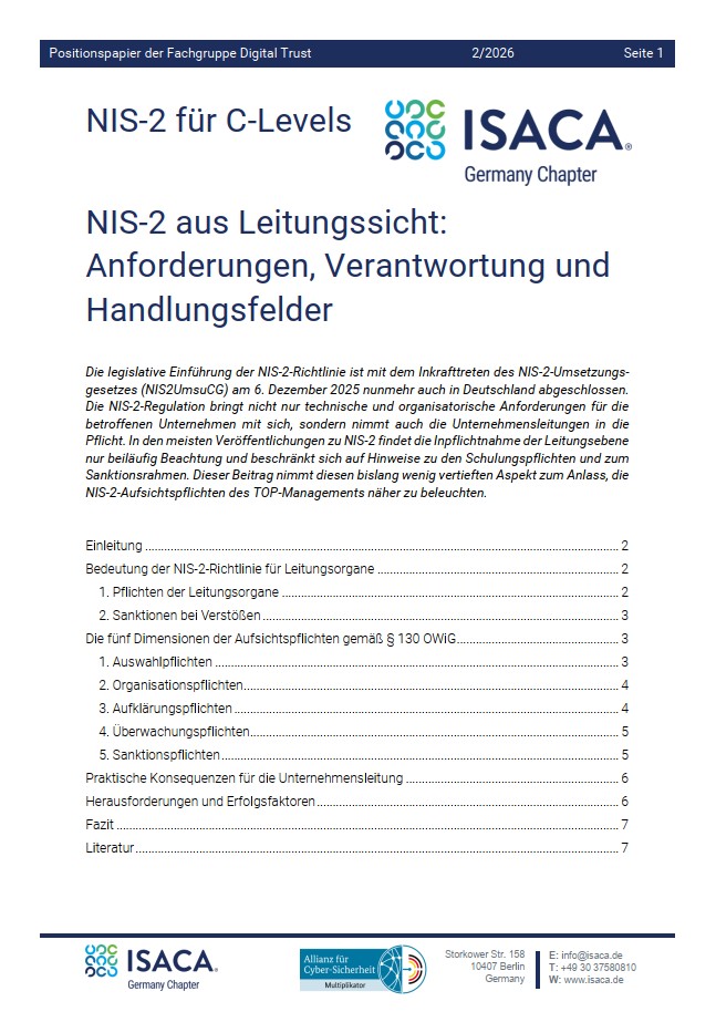 NIS-2 aus Leitungssicht: Anforderungen, Verantwortung und Handlungsfelder Die legislative Einführung der NIS-2-Richtlinie ist mit dem Inkrafttreten des NIS-2-Umsetzungsgesetzes (NIS2UmsuCG) am 6. Dezember 2025 nunmehr auch in Deutschland abgeschlossen. Die NIS-2-Regulation bringt nicht nur technische und organisatorische Anforderungen für die betroffenen Unternehmen mit sich, sondern nimmt auch die Unternehmensleitungen in die Pflicht. In den meisten Veröffentlichungen zu NIS-2 findet die Inpflichtnahme der Leitungsebene nur beiläufig Beachtung und beschränkt sich auf Hinweise zu den Schulungspflichten und zum Sanktionsrahmen. Dieser Beitrag unserer Fachgruppe Digital Trust nimmt diesen bislang wenig vertieften Aspekt zum Anlass, die NIS-2-Aufsichtspflichten des TOP-Managements näher zu beleuchten. Jahr: 2026 Thema: Informationssicherheit Herunterladen